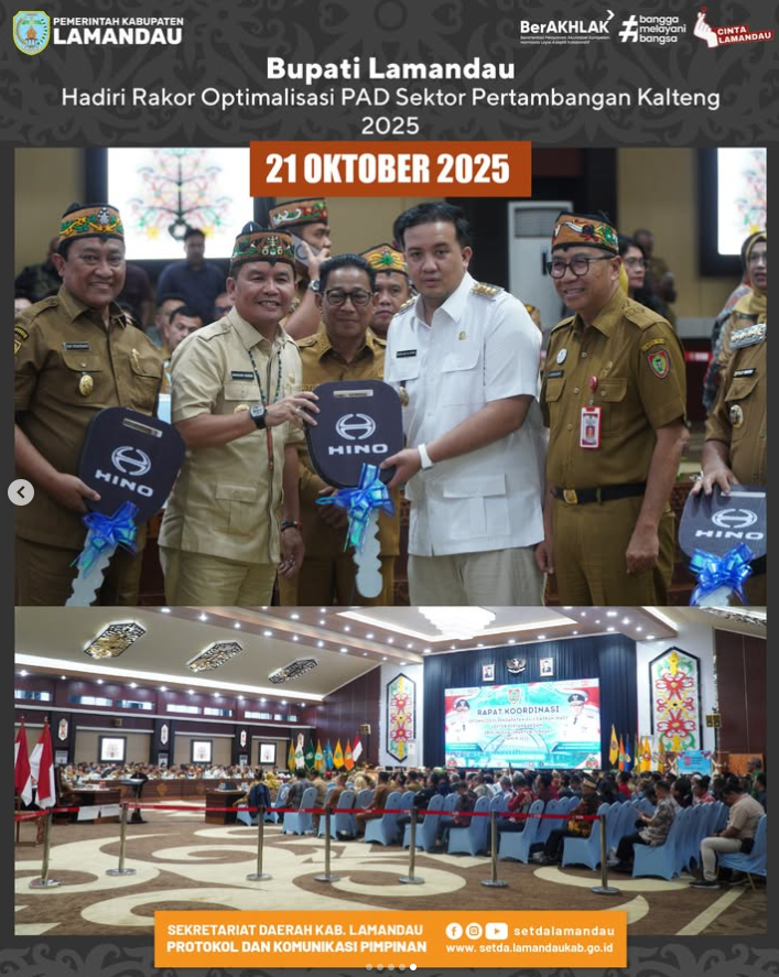Palangka Raya – Selasa (21/10), Bupati Lamandau Rizky Aditya Putra menghadiri Rapat Koordinasi Optimalisasi Pendapatan Asli Daerah (PAD) Sektor Pertambangan Provinsi Kalimantan Tengah Tahun 2025 yang dilaksanakan di Aula Jayang Tingang, Kantor Gubernur Kalteng. Kegiatan yang dipimpin langsung oleh Gubernur Kalteng ini dihadiri seluruh Bupati/Wali Kota se-Kalteng, jajaran OPD provinsi, serta pimpinan perusahaan pertambangan.