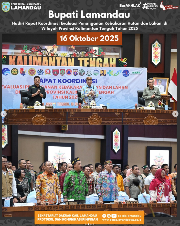 Palangka Raya, Kamis (16/10) – Bertempat di Aula Jayang Tingang, Kantor Gubernur Prov. Kalteng, Bupati Lamandau Rizky Aditya Putra, S.E, M.M. menghadiri Rapat Koordinasi Evaluasi Penanganan Kebakaran Hutan dan Lahan di Wilayah Provinsi Kalimantan Tengah Tahun 2025. Turut hadir Plt. Sekretaris Daerah Prov. Kalteng, Perwakilan Kementerian Kehutanan RI, Perwakilan Kementerian Lingkungan Hidup RI, Perwakilan Kepala Daerah se-Kalimantan Tengah, unsur Forkopimda se-Kalimantan Tengah, OPD terkait serta undangan lainnya.