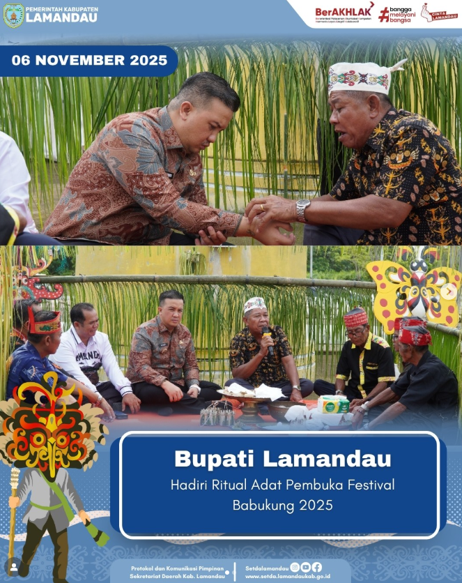 Nanga Bulik, Kamis (06/11) – Bupati Lamandau, Rizky Aditya Putra, S.E., M.M., menghadiri secara langsung Ritual Adat sebagai pembuka rangkaian acara Festival Babukung Tahun 2025 yang digelar di Nanga Bulik. Kehadiran Bupati beserta jajaran pemerintah daerah menunjukkan dukungan penuh terhadap pelestarian adat dan budaya masyarakat Dayak Tomun yang menjadi identitas daerah Kabupaten Lamandau.