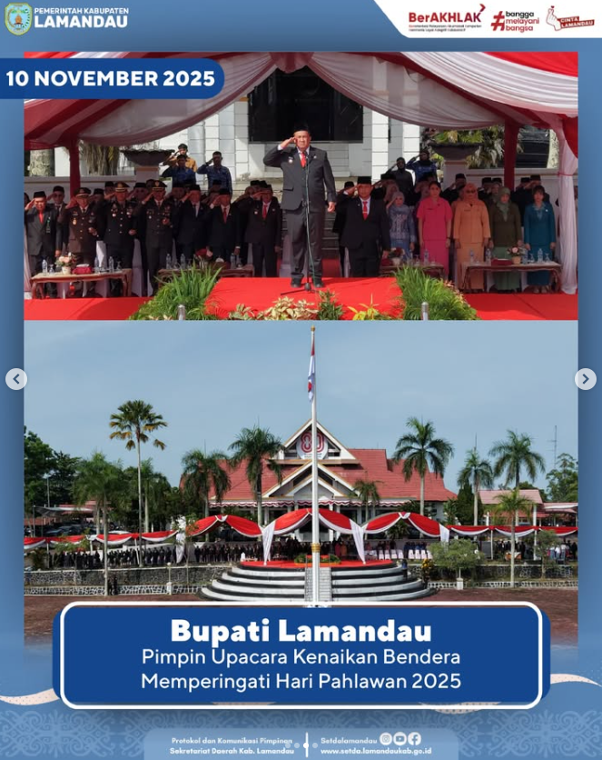 Nanga Bulik, Senin (10/11) – Bupati Lamandau, Rizky Aditya Putra, S.E., M.M., memimpin Upacara Kenaikan Bendera Memperingati Hari Pahlawan 2025. Turut hadir unsur Forkopimda, Sekretaris Daerah, Kepala OPD serta undangan lainnya.