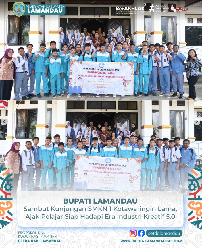 Nanga Bulik – Kamis (05/02), Bupati Lamandau menerima kunjungan belajar peserta didik SMKN 1 Kotawaringin Lama di Aula Sekretariat Daerah Kabupaten Lamandau, . Kunjungan ini dilaksanakan dalam rangka mengenalkan potensi industri kreatif daerah sekaligus memberikan pemahaman kepada generasi muda mengenai peluang dan tantangan dunia usaha di masa depan.