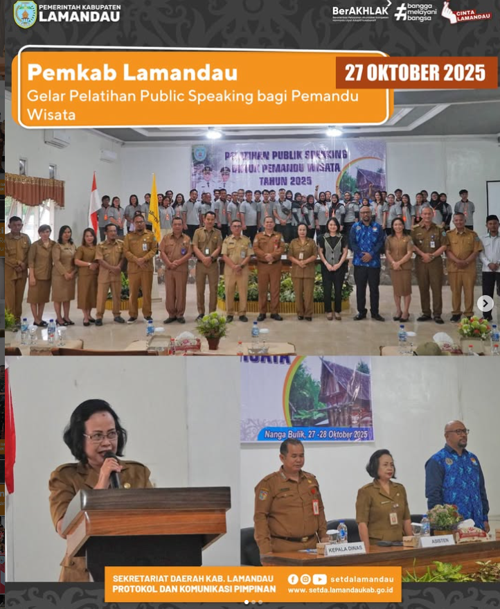 Nanga Bulik, Senin (27/10) – Pemerintah Kabupaten Lamandau melalui Dinas Pariwisata menggelar Pelatihan Public Speaking bagi Pemandu Wisata, bertempat di Aula Hotel Putri Tunggal, Nanga Bulik. Kegiatan tersebut dibuka secara resmi oleh Asisten Administrasi Umum Sekretariat Daerah Kabupaten Lamandau, yang hadir mewakili Bupati Lamandau. Turut dihadiri Camat Delang, para Kepala OPD, serta para tamu undangan lainnya.