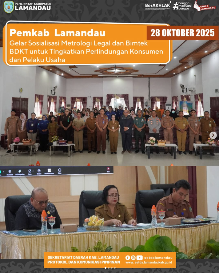 Nanga Bulik – Selasa (28/10), Pemerintah Kabupaten Lamandau menggelar Sosialisasi Metrologi Legal dan Bimbingan Teknis Barang dalam Keadaan Terbungkus (BDKT) bagi pelaku usaha di wilayah Lamandau. Kegiatan yang dihadiri perwakilan Forkopimda, OPD terkait, dan pelaku UMKM ini secara resmi dibuka oleh Asisten Administrasi Umum Setda Kabupaten Lamandau, mewakili Bupati Lamandau.