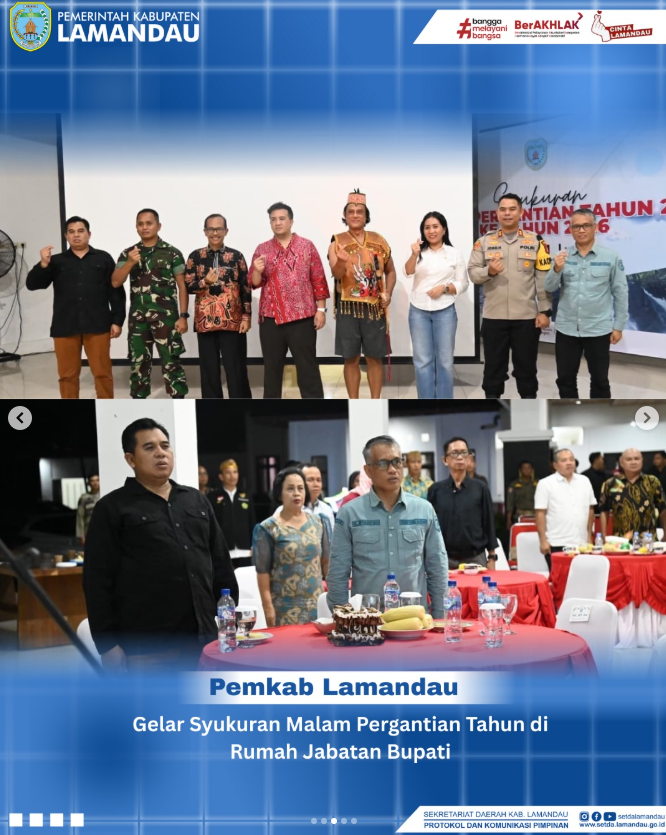 Nanga Bulik, Rabu (31/12) — Dalam rangka mengisi malam pergantian Tahun Baru 2025 menuju 2026, Pemerintah Kabupaten Lamandau menggelar kegiatan Syukuran dan Do’a Bersama Lintas Agama di Rumah Jabatan Bupati Lamandau. Kegiatan ini dihadiri Bupati Lamandau Rizky Aditya Putra dan Wakil Bupati Lamandau Abdul Hamid, unsur Forkopimda, Sekretaris Daerah, para Asisten di lingkup Sekretariat Daerah, kepala OPD, tokoh agama, tokoh adat, tokoh masyarakat, serta masyarakat Kabupaten Lamandau.