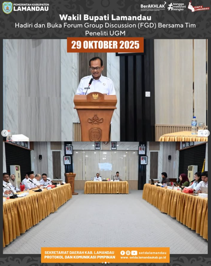 Di akhir sambutannya, Wakil Bupati Lamandau menyampaikan terima kasih dan apresiasi setinggi-tingginya kepada Universitas Gadjah Mada atas kerja sama dan dedikasinya dalam mendukung pembangunan daerah. Dengan dibukanya secara resmi kegiatan FGD tersebut, diharapkan sinergi antara pemerintah, akademisi, dan masyarakat dapat semakin erat dalam mewujudkan Lamandau yang maju dan sejahtera.
