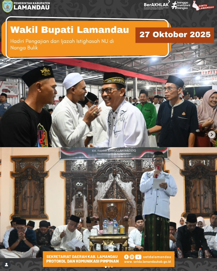 Nanga Bulik – Senin(27/10), Wakil Bupati Lamandau menghadiri kegiatan Pengajian dan Ijazah Istighasah yang diselenggarakan oleh Nahdlatul Ulama (NU) Kabupaten Lamandau di Nanga Bulik. Kegiatan ini turut dihadiri oleh KH. Fahmi Amrullah Hadzik, cucu dari pendiri NU, Hadratussyaikh KH. M. Hasyim Asy’ari, serta diikuti para kiai, alim ulama, tokoh masyarakat, dan jamaah dari berbagai wilayah.