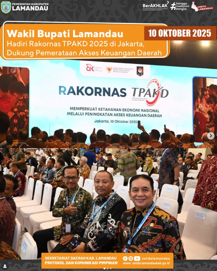 Jakarta – Jum’at (10/10), Wakil Bupati Lamandau Abdul Hamid menghadiri Rapat Koordinasi Nasional Tim Percepatan Akses Keuangan Daerah (TPAKD) 2025 di Balai Kartini, Jakarta. Kegiatan ini mengusung tema “Memperkuat Ketahanan Ekonomi Nasional Melalui Peningkatan Akses Keuangan Daerah”, dengan fokus mempersempit kesenjangan inklusi keuangan antara pusat dan daerah.